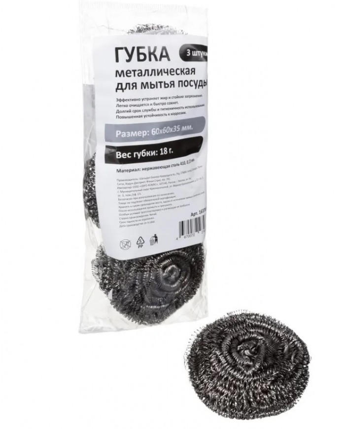Губка-мочалка для посуды металлическая 6x6 см 18 г (3 штуки в упаковке). Губка-мочалка предназначена для эффективной чистки кастрюль, чугунных сковород и противней. Также можно использовать для удаления грязи с керамики, бытовой техники - плит, микроволновых печей, духовок и т.д. Оцинкованная железная проволока, из которой изготовлена мочалка, быстро и качественно удаляет въевшиеся загрязнения. Изделие отличается длительным сохранением своих эксплуатационных свойств. Рекомендуется использовать губку в хозяйственных перчатках. После использования тщательно промыть и просушить. Размер губки: 6x6x3.5 см. Поставляется упаковками по 3 штуки.
