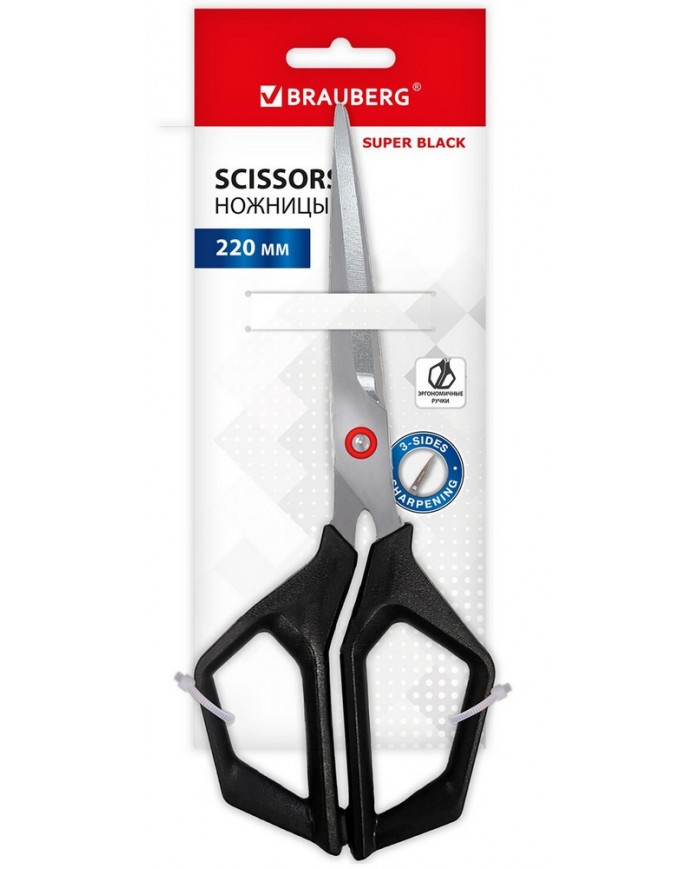 Ножницы BRAUBERG "Super black" 220 мм, черные, 3-сторонняя заточка, ручки из ABS-пластика,
