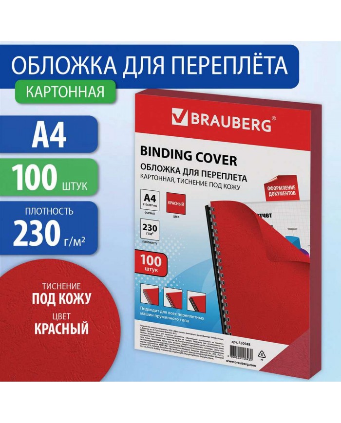 Обложки картонные для переплета, А4, КОМПЛЕКТ 100 шт., тиснение под кожу, 230 г/м2, красные, BRAUBER