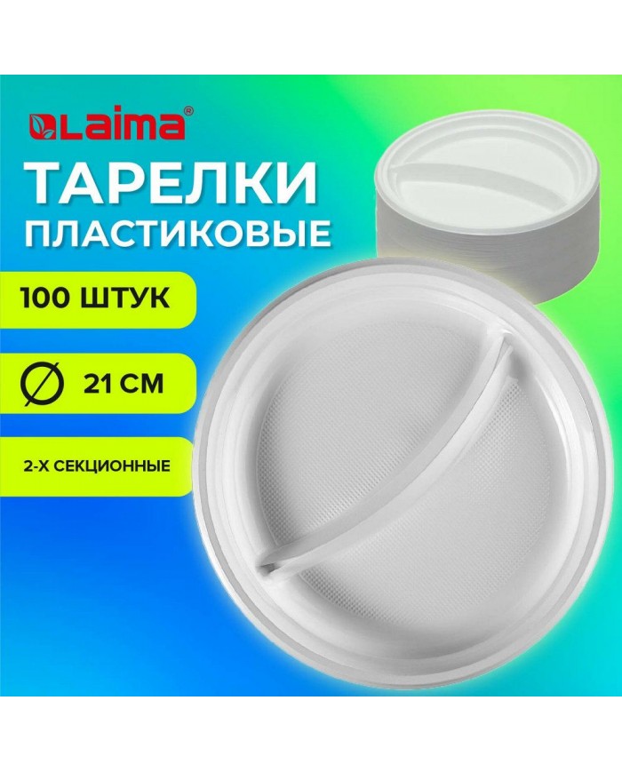 Одноразовые тарелки 2-х секционные КОМПЛЕКТ 100 шт. 210 мм, белые, ПС, холодное/горячее, LAIMA БЮДЖЕ