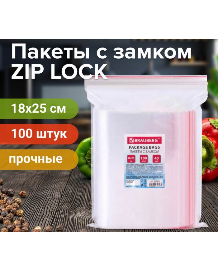 Пакеты с замком ZIP LOCK "зиплок", комплект 100 шт., 180х250 мм, ПВД, толщина 40 микрон, BRAUBERG