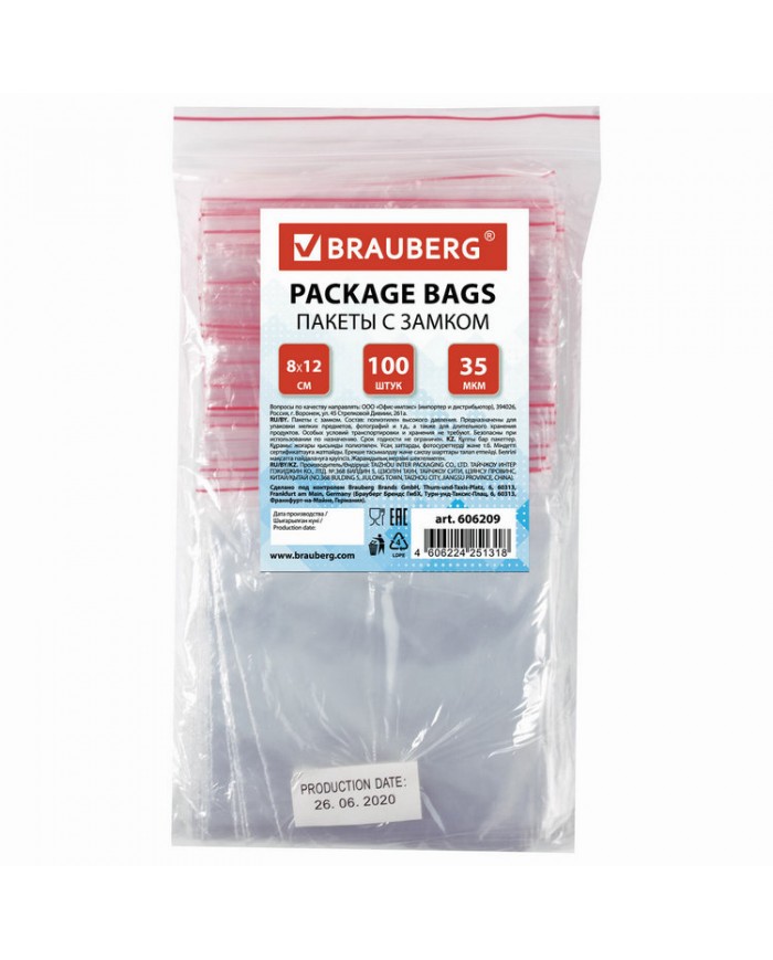 Пакеты с замком ZIP LOCK "зиплок", комплект 100 шт., 80х120 мм, ПВД, толщина 35 микрон, BRAUBERG