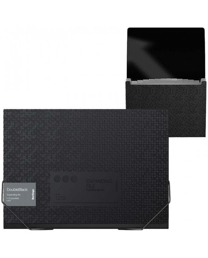 Папка-картотека пластиковая на резинках с отделениями Berlingo "DoubleBlack" формата А4, черного цвета, с рельефным рисунком. 12 внутренних отделений для удобного хранения и организации документов. Каждое отделение с индексным полем, позволяет сортировать документы по темам или алфавиту. Надежные застежки-резинки. Черный цвет внутренней поверхности. Быстрый доступ к содержимому. Изготовлена из высококачественного полипропилена с матовой текстурой поверхности "песок", на которой не видно отпечатков пальцев и мелких царапин. Предназначена для хранения и транспортировки документов. Толщина обложки 700мкм. Вмещает до 300 листов. Размер 230*335*35. В комплекте бумажные индексы с английскими буквами с одной стороны и, пустые, для заполнения, с оборотной. Упакована в индивидуальный прозрачный пакет по форме.