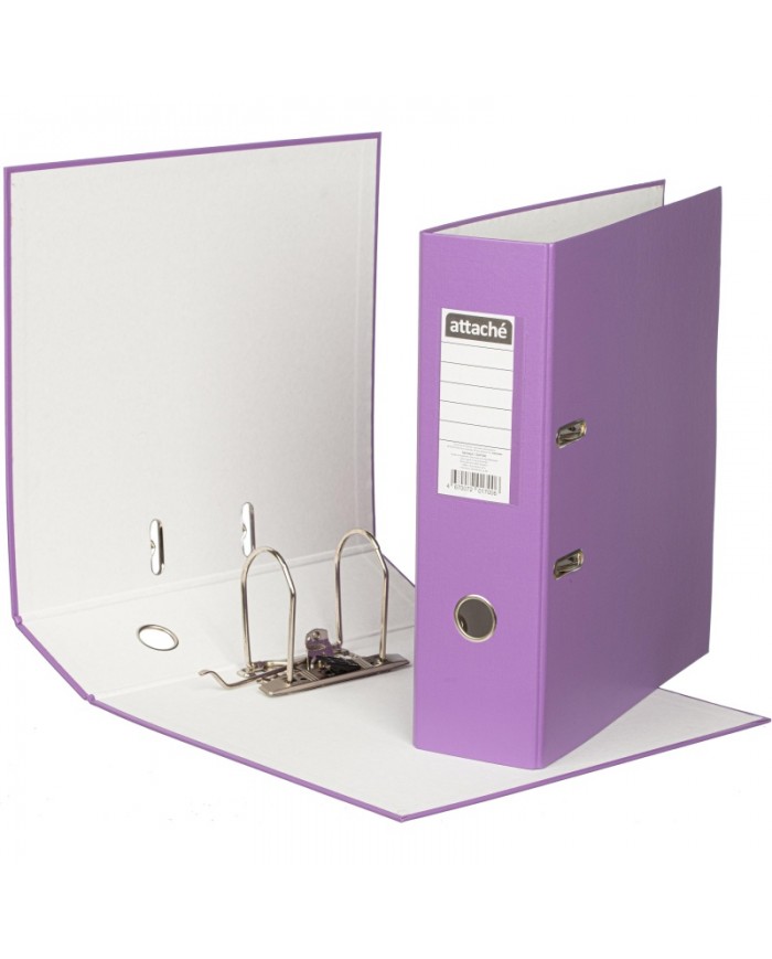 Папка-регистратор с арочным механизмом Attache изготовлена из плотного картона, с внешней стороны обтянута бумвинилом сиреневого цвета. Корешок - бумажный. На корешке шириной 90 мм есть карман с этикеткой и кольцо для удобного захвата.