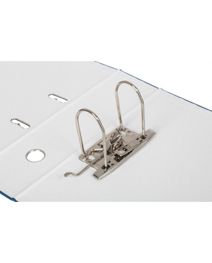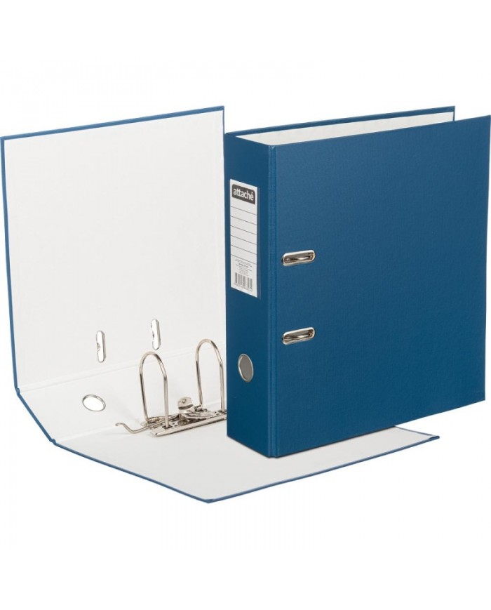 Папка-регистратор с арочным механизмом Attache изготовлен из плотного картона, с внешней стороны обтянута бумвинилом синего цвета. На корешке шириной 90 мм есть карман с этикеткой и кольцо для удобного захвата