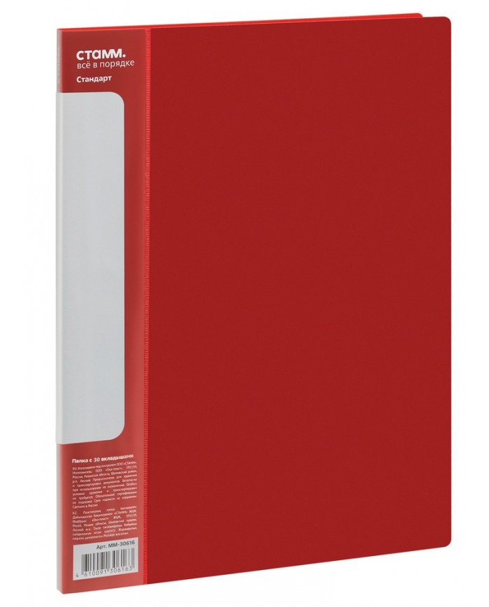 Папка с 30 вкладышами СТАММ «Стандарт» – отличный помощник для хранения бумаг формата А4. Размер изделия составляет 310*235 мм. Ширина корешка – 17 мм. Папка красного цвета изготовлена из качественного полипропилена толщиной 600 мкм с текстурой «песок». Тип скрепления – термосварка. Бумагам, вложенным в папку, не требуется перфорация дыроколом. На корешке папки есть удобный карман. Папка упакована в индивидуальный пакет.