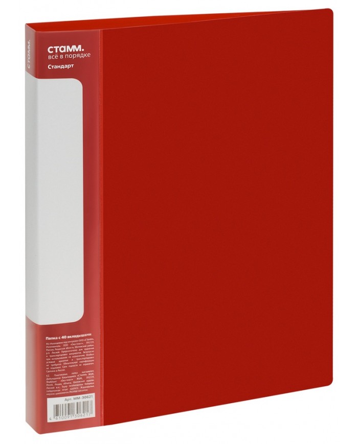 Папка с 40 вкладышами СТАММ «Стандарт» – отличный помощник для хранения бумаг формата А4. Размер изделия составляет 310*235 мм. Ширина корешка – 21 мм. Папка красного цвета изготовлена из качественного полипропилена толщиной 600 мкм с текстурой «песок». Тип скрепления – термосварка. Бумагам, вложенным в папку, не требуется перфорация дыроколом. На корешке папки есть удобный карман. Папка упакована в индивидуальный пакет.