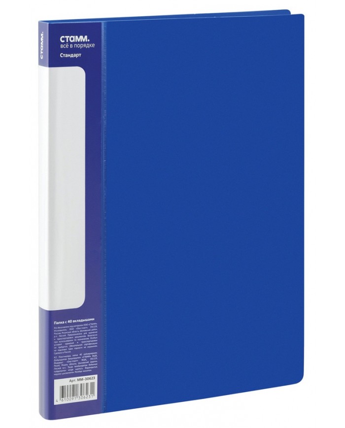 Папка с 40 вкладышами «СТАММ» серии «Стандарт» предназначена для хранения бумаг формата А4. Цвет папки – синий. Папка изготовлена из качественного полипропилена толщиной 600 мкм с текстурой «песок». Тип скрепления – термосварка. Размер изделия составляет 310*235 мм. Ширина корешка – 21 мм. Бумагам, вложенным в папку, не требуется перфорация дыроколом. На корешке папки имеется карман. Папка упакована в индивидуальный пакет.
