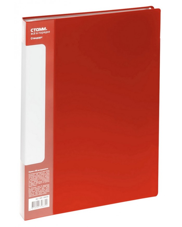 Папка с 80 вкладышами «СТАММ» серии «Стандарт» предназначена для хранения бумаг формата А4. Цвет папки – красный. Папка изготовлена из качественного полипропилена толщиной 800 мкм с текстурой «песок». Тип скрепления – термосварка. Размер изделия составляет 310*235 мм. Ширина корешка – 30 мм. Бумагам, вложенным в папку, не требуется перфорация дыроколом. На корешке папки имеется карман. Папка упакована в индивидуальный пакет.