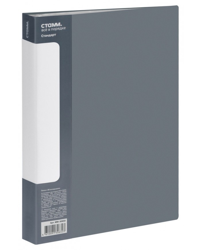 Папка с 80 вкладышами «СТАММ» «Стандарт» предназначена для хранения бумаг формата А4. Цвет папки – серый. Папка изготовлена из качественного полипропилена толщиной 800 мкм с текстурой «песок». Тип скрепления – термосварка. Размер изделия составляет 310*235 мм. Ширина корешка – 30 мм. Бумагам, вложенным в папку, не требуется перфорация дыроколом. На корешке папки имеется карман. Папка упакована в индивидуальный пакет.