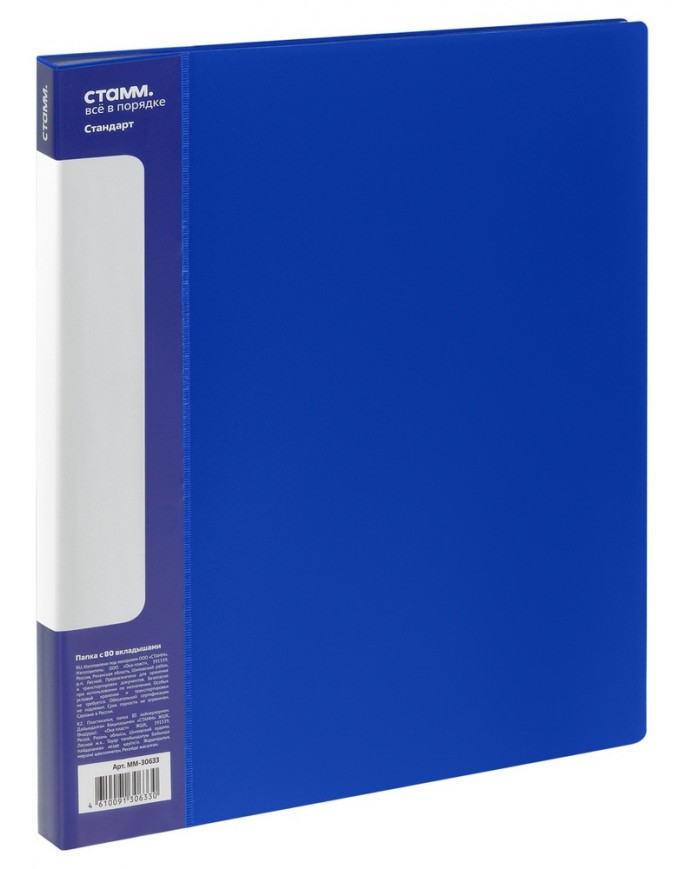 Папка с 80 вкладышами СТАММ «Стандарт» – отличный помощник для хранения бумаг формата А4. Размер изделия составляет 310*235 мм. Ширина корешка – 30 мм. Папка синего цвета изготовлена из качественного полипропилена толщиной 800 мкм с текстурой «песок». Тип скрепления – термосварка. Бумагам, вложенным в папку, не требуется перфорация дыроколом. На корешке папки есть удобный карман. Папка упакована в индивидуальный пакет.