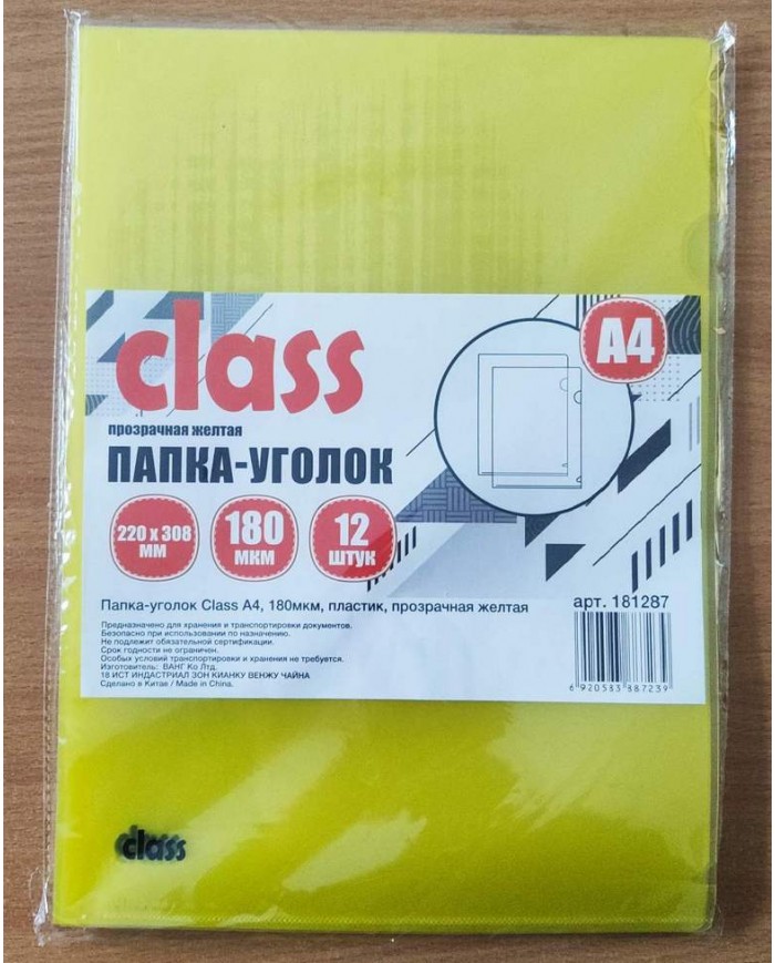 Папка-уголок Class А4, 180мкм, пластик, прозрачная желтая
