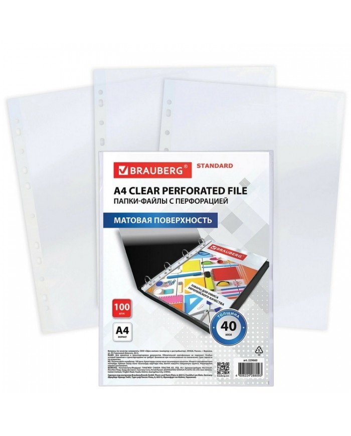 Папка-вкладыш А4 40мкм. перфорированн. BRAUBERG "STANDARD", КОМПЛЕКТ 100 шт., матовые