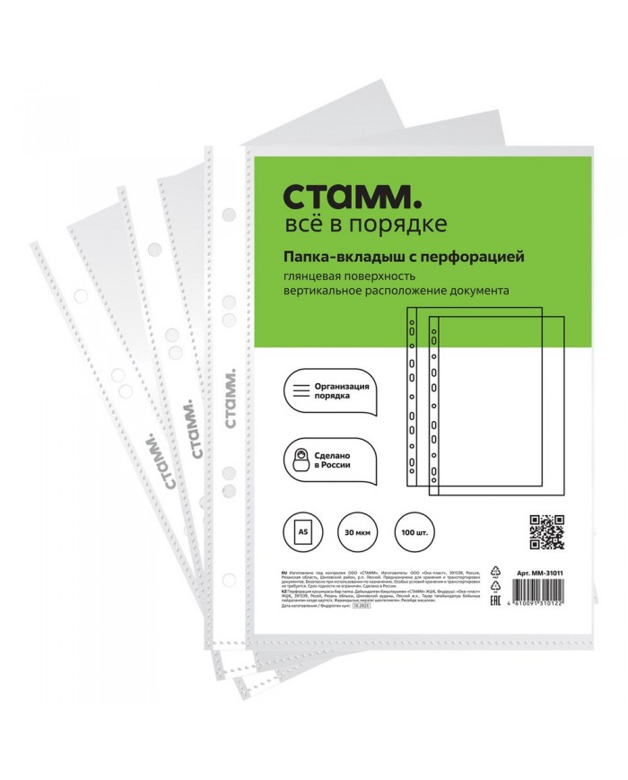 Папка-вкладыш с перфорацией «СТАММ» отлично подойдет для хранения и систематизации документов. Папка размером 220*170 мм изготовлена из полипропилена толщиной 30 мкм. Папка вмещает до 50 листов. Имеет глянцевую текстуру, защищает листы от внешних воздействий. Перфорация на боковой части позволяет разместить изделие в папке с любым кольцевым механизмом или скоросшивателе. Упакованы в пакет по 100 штук.