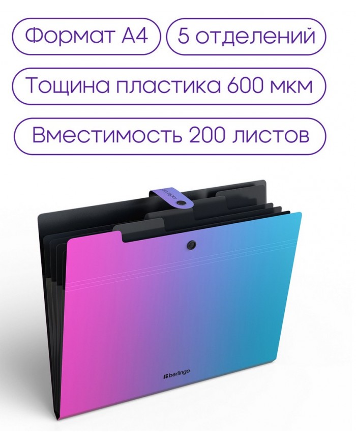 Папка пластиковая на кнопке с отделениями Berlingo "Radiance" формата А4. Цвет: розово-голубой градиент. 5 внутренних отделений для удобного хранения ..