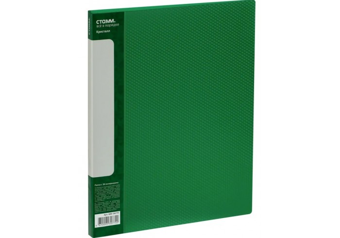 Папка с 20 вкладышами «СТАММ» серии «Кристалл» – отличный помощник для хранения бумаг формата А4. Изделие выполнено в полупрозрачном зеленом цвете. Вн..