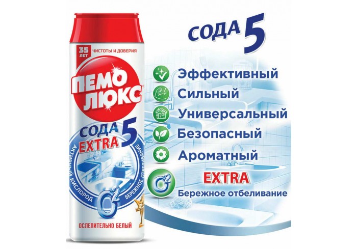 Чистящее средство 480 г, ПЕМОЛЮКС Сода-5 Экстра, "Ослепительно Белый", порошок,