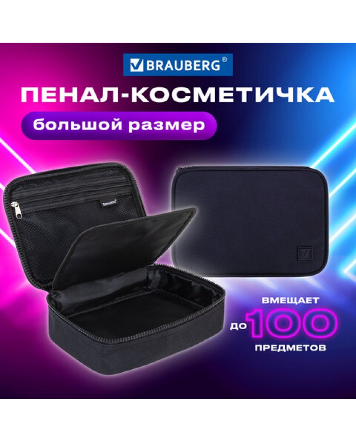 Пенал прямоугольной формы с одним вместительным отделением и органайзером внутри. Выполнен из плотного полиэстера, внутри есть подкладка, которая дополнительно защищает содержимое. Пенал имеет увеличенный размер, что позволяет размещать в нем не только письменные принадлежности, но и повседневные мелочи, косметику, аксессуары, таким образом может выполнять роль универсальной сумочки-косметички, которую можно всегда взять с собой. Упакован в ПЭТ-пакет с европодвесом, который сохранит качество и товарный вид при хранении и транспортировке. Универсальные косметички BRAUBERG – это высокое качество и проработанные до мелочей модели с современным дизайном и широким функционалом. На протяжении 15 лет наши специалисты сосредоточены на разработке, производстве и совершенствовании товаров повседневного спроса для детей и взрослых. Именно поэтому BRAUBERG знают и выбирают по всей стране.