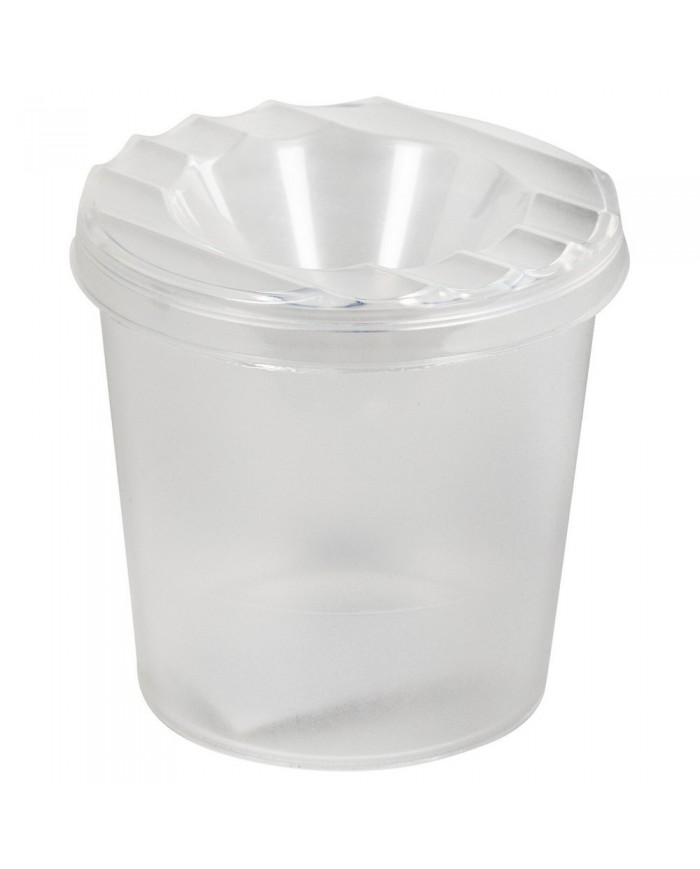 Стакан выполнен из прочного пластика. Линия на прозрачном корпусе указывает на максимально возможный уровень наполнения. Специальная форма крышки стакана исключает возможность вытекания воды. На крышке имеются углубления для размещения кисточек. Полный объем - 210 мл. Объем до уровня наполнения - 75 мл.