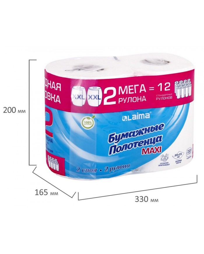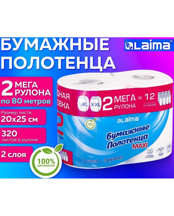 Полотенца бумажные спайка 2 рулона по 80 метров, LAIMA МЕГА РУЛОН, 2 слоя, 20х25 см, 100% целлюлоза,