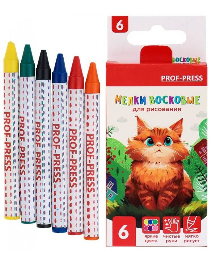 Восковые мелки для детского творчества помогают развитию мелкой моторики и способствуют выражению эмоций через рисунок. Яркие насыщенные цвета и качество — всё, что нужно для красивого рисунка и хорошего настроения! Восковые мелки от компании "Проф-Пресс" представлены в наборе из 6 цветов. Продаются в картонной коробке с подвесом. Размер мелка 8,9 х 0,8 см.