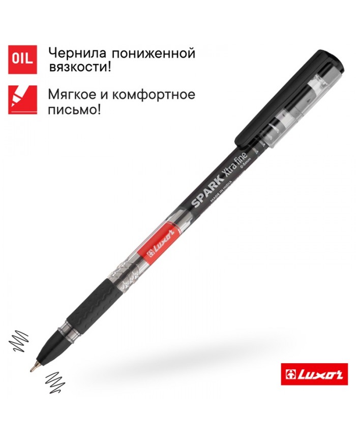 Шариковая ручка Luxor Spark - функциональная ручка для ежедневного использования. Диаметр пишущего узла - 0,7 мм, что говорит о том, что изделие подходит для любого типа письма. Толщина линии письма составляет 0,5 мм. Ручка подходит для учебы, работы, для ведения документооборота, заметок в ежедневнике, рисунков в скетчбуке. Цвет чернил - чёрный. Изделия не имеют привычного кнопочного механизма подачи стержня, однако имеют прочный колпачок с с пластиковым клипом. Он позволит прикрепить ручку к ежедневнику или блокноту. Чернила изготовлены на масляной основе и благодаря пониженной вязкости они обеспечивают мягкое ровное письмо и уверенное скольжение по бумаге. Корпус лёгкий и лаконичен по форме, а значит при письме напряжение на руку не ощущается. Набор из 12 ручек упакован в картонную коробку.