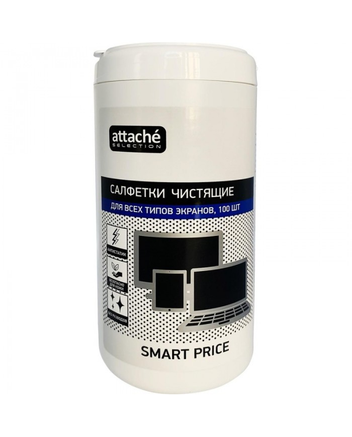Салфетки влажные Attache Selection Smart Price для всех типов экранов (100 штук в тубе) Влажные салфетки Attache Selection изготовлены из нетканого материала повышенной плотности на основе полипропилена, подходят для очистки LCD и TFT экранов мониторов, телевизоров, плазменных панелей, ноутбуков, стеклянных поверхностей сканеров, копиров и других устройств. Не оставляют разводов и ворса. Экономичный расход. Специальный состав с активными компонентами пролонгированного действия безупречно очищает