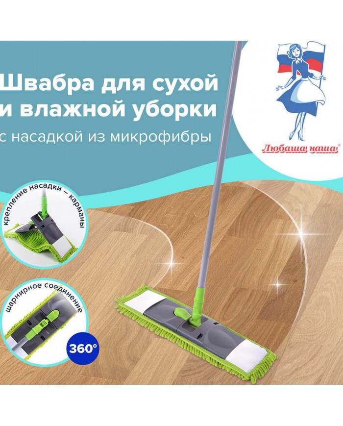 Швабра с флаундером 40 см, черенок 110 см евро, насадка МОП микрофибра СИНЕЛЬ букли, Любаша