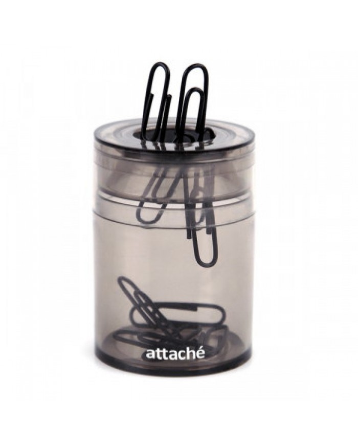Скрепочница магнитная Attache Mini круглой формы выполнена в тонированном прозрачном пластиковом корпусе цвета графит. Загрузка скрепок производится сверху, сильный магнит не позволяет им произвольно высыпаться. Скрепочница помогает поддерживать порядок на рабочем месте. Скрепки в комплект не входят. Размеры скрепочницы: 42x42x60 мм. Диаметр отверстия: 24 мм.