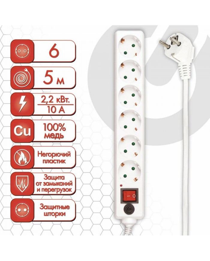 Сетевой фильтр SONNEN U-365, 6 розеток, с заземлением, выключатель, 10 А, 5 м, белый