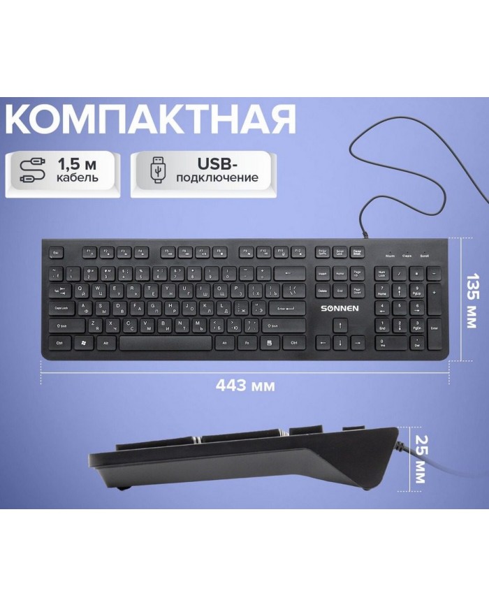 Клавиатура проводная SONNEN KB-8280, USB, 104 плоские клавиши, черная,