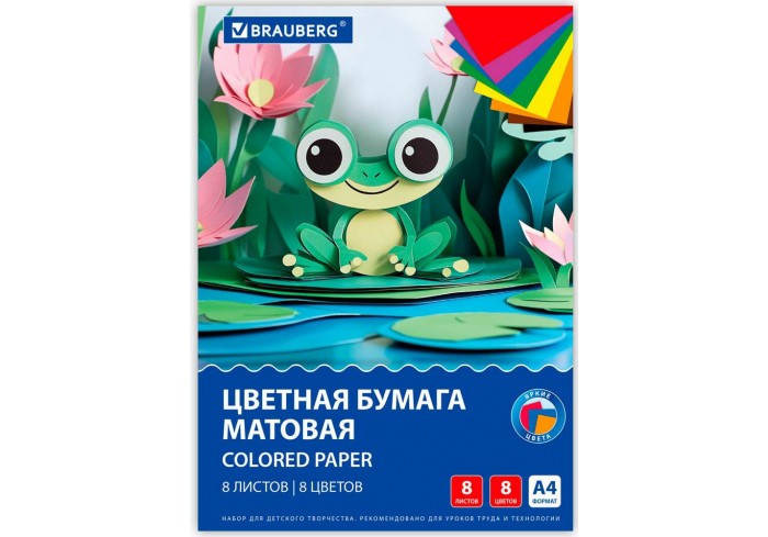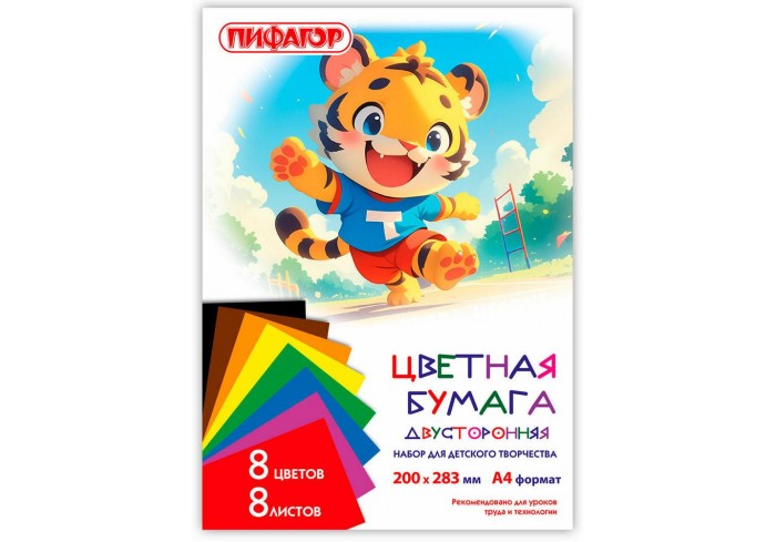 Набор офсетной односторонней цветной бумаги плотностью 65 г/м2 включает 8 листов формата А4 (200х283 мм) в 8 разнообразных и насыщенных однородных цве..
