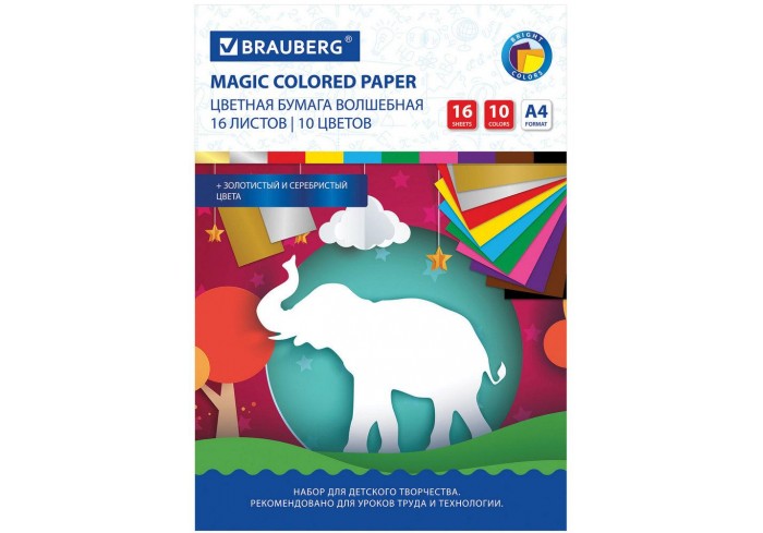 Набор офсетной односторонней цветной бумаги плотностью 65 г/м2 включает 16 листов формата А4 (200х275 мм) в 8-ми разнообразных и насыщенных однородных..