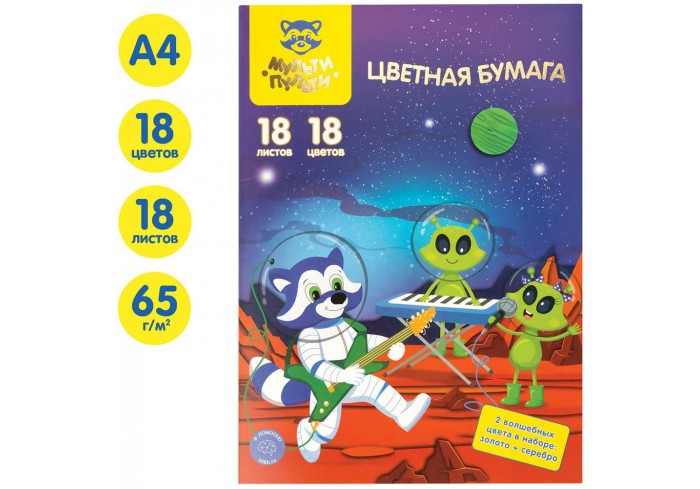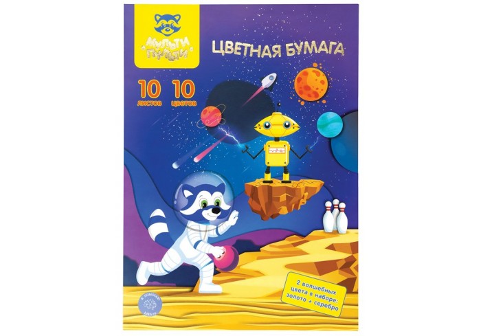 Набор цветной двусторонней офсетной бумаги «Мульти-Пульти» серии «Енот в космосе. Волшебная» замечательно подойдет для творчества. Бумага имеет размер..