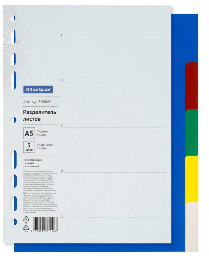 Пластиковые разделители листов OfficeSpace предназначены для сортировки и систематизации документов внутри папок, обеспечивают сохранность и аккуратность листов. Изготовлены из пластика толщиной 120 мкм. Размер 162*210 мм. В комплект входит 5 листов синего, красного, серого, зеленого и желтого цвета, а также титульный лист для оглавления. Удобны в использовании, перфорация позволяет подшивать разделители во все типы папок.