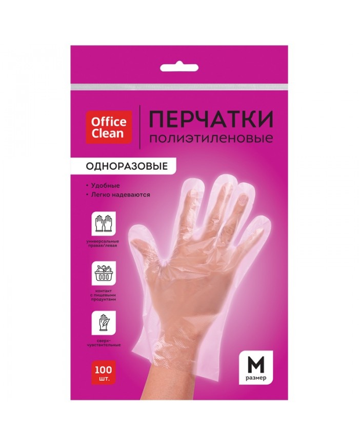 Перчатки полиэтиленовые одноразовые OfficeClean, разм. M, 50 пар (100 шт.), пакет с европодвесом