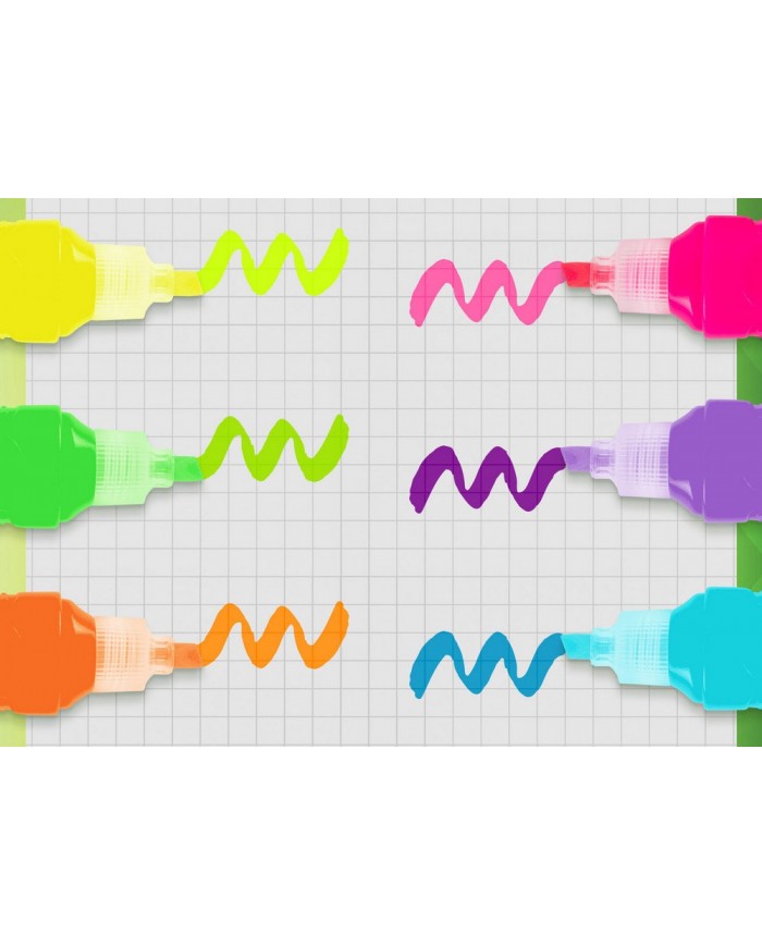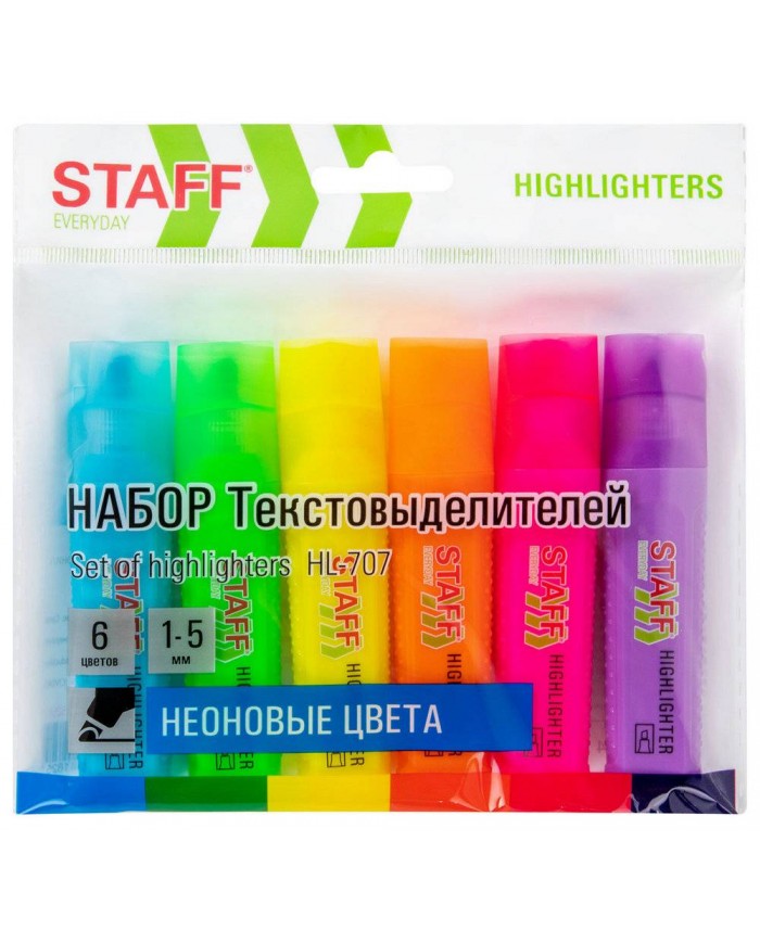6 неоновых цветов в наборе: желтый, зеленый, оранжевый, розовый, фиолетовый и голубой, – позволяют ярко выделить важное в тексте. Колпачок и корпус соответствуют цвету чернил. Прямоугольный корпус диаметром 24 мм оснащен удобной зоной захвата. Скошенный наконечник имеет толщину линии письма от 1 до 5 мм, что обеспечивает удобство при работе с текстом, напечатанным мелким шрифтом, или таблицами. Светоустойчивые чернила на водной основе не выцветают даже на открытом солнце, быстро впитываются и не размазываются в процессе использования. Текстовыделители обладают экономным расходом чернил. Изделия не перезаправляются. Это товар эконом-сегмента, поэтому он отличается привлекательной ценой. Товар обладает базовым набором характеристик и простой упаковкой, при этом полностью соответствует основным требованиям потребителей.