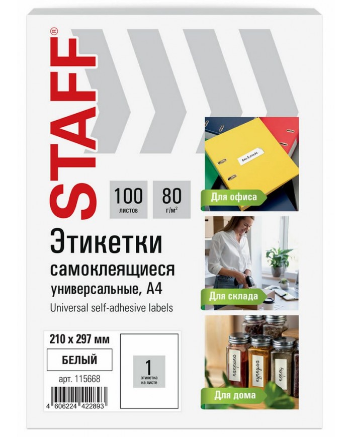 Этикетка самоклеящаяся 210х297 мм, 1 этикетка, белая, 80 г/м2, 100 листов, STAFF BASIC,
