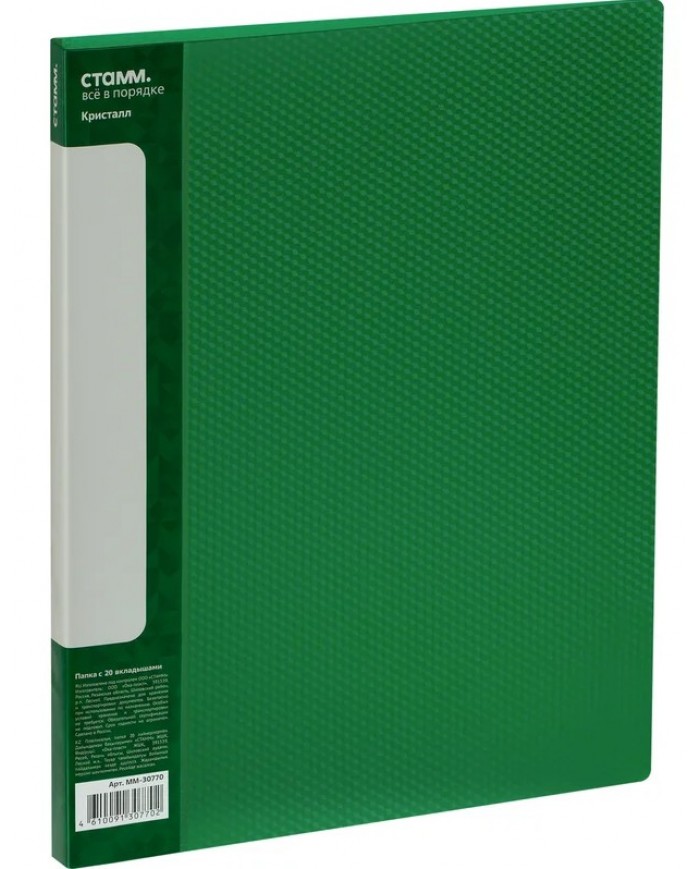 Папка с 20 вкладышами «СТАММ» серии «Кристалл» – отличный помощник для хранения бумаг формата А4. Изделие выполнено в полупрозрачном зеленом цвете. Внешняя сторона папки дополнена фактурным паттерном «Кристалл», сохраняющим внешний вид изделия от загрязнений и повреждений. Размер изделия составляет 310*235 мм. Ширина корешка – 14 мм. Тип скрепления – термосварка. Бумагам, вложенным в папку, не требуется перфорация дыроколом. На корешке папки есть удобный карман. Папка упакована в индивидуальный пакет.