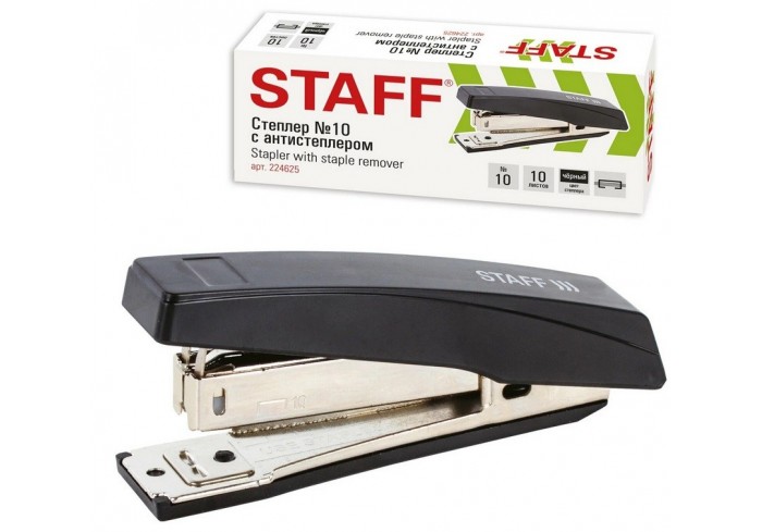 Настольный степлер STAFF с антистеплером в черном пластиковом корпусе с металлическим механизмом cпособен скрепить до 10 листов. Подходящий размер ско..