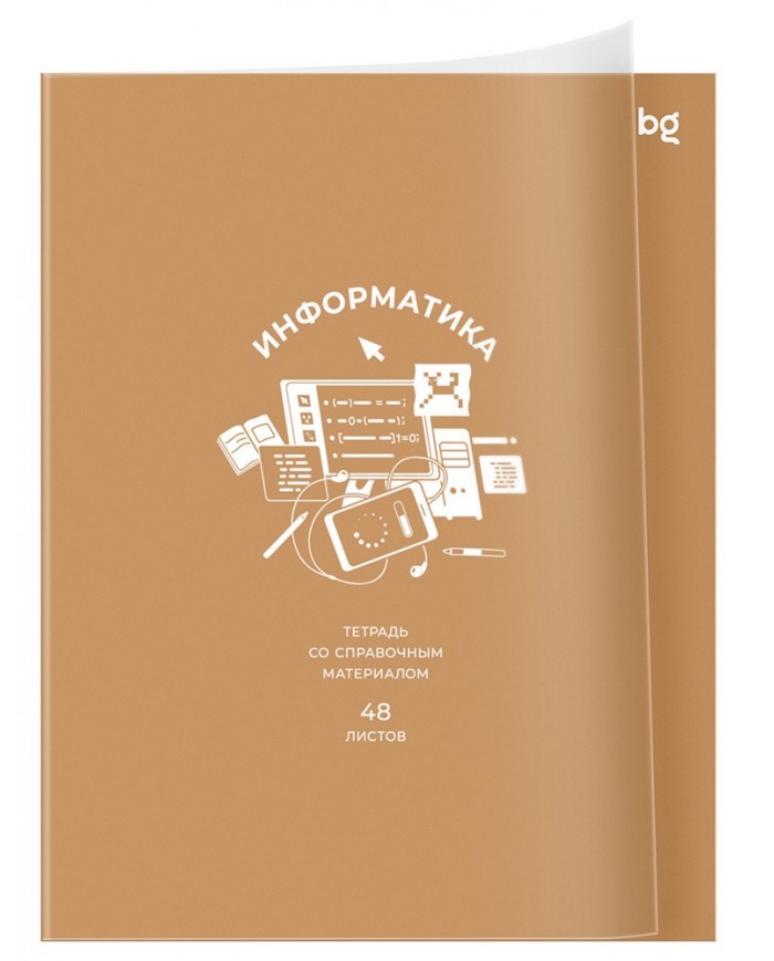 Предметная тетрадь BG «Информатика» со справочной информацией на форзаце и обороте понадобится ученикам 7 класса и старше. Она входит в серию «», в которой представлено 12 тетрадей. Формат изделия — А5. Внутренний блок на скрепке состоит из 48 листов в клетка с полями. В тетради используется офсетная бумага плотностью 60 г/кв.м. Белизна блока — 100 %. Обложка выполнена из мелованной бумаги с пластиковой обложкой и имеет прямые углы.