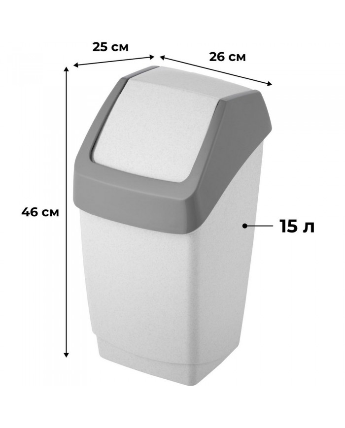 Ведро для мусора с крышкой-вертушкой М-пластика Хапс 15 л пластик серое/черное (26?25?46 см). Ведро для мусора «М-пластика» с крышкой-вертушкой выполнено из высококачественного прочного пластика, отвечающего всем нормам экологической безопасности. Урна оснащена крышкой с механизмом-вертушкой. Удобное и практичное решение для сбора мусора. Подходит для бытовых и офисных помещений. Размер контейнера: 26?25?46 см. Цвет: серый, черный. Вес: 0.8 кг. Внимание: в характеристике «Объем рекомендуемого мешка» указан минимальный объем мешка, который подойдет для изделия. Рекомендуется приобретать мешки указанного, либо большего объема.