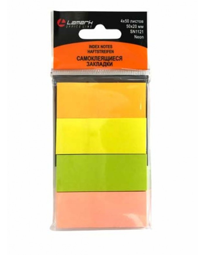 Самоклеящиеся бумажные закладки Lamark предназначены для маркировки страниц, помогут выделить нужную информацию на листе, организовать цветовое деление разделов. Размер 50x20 мм. 4 цвета неон по 50 листов.