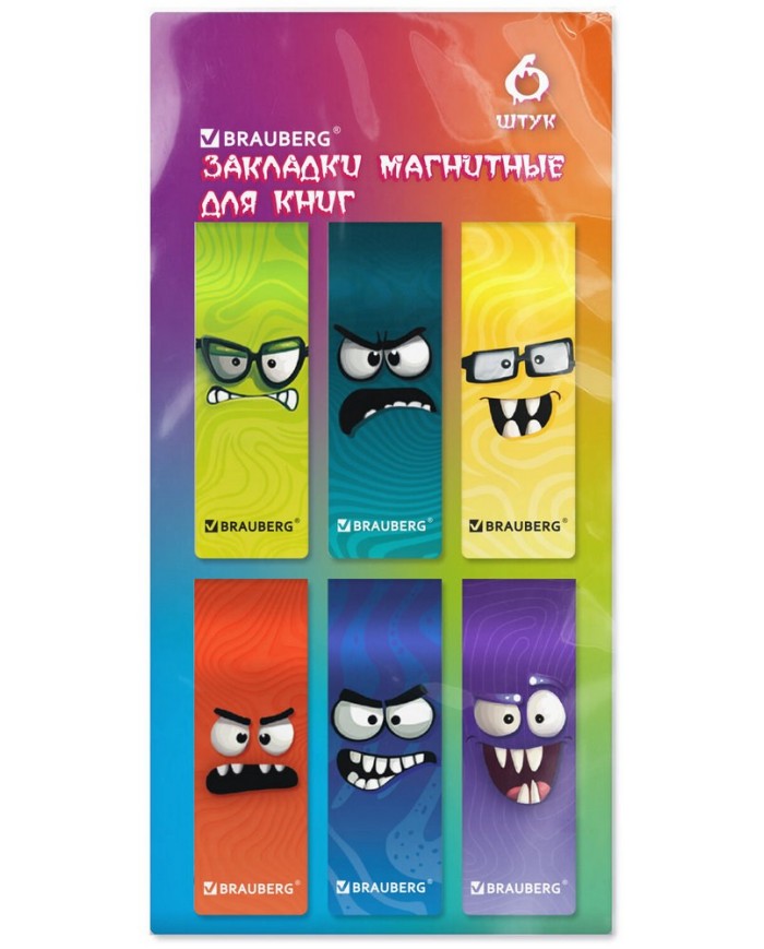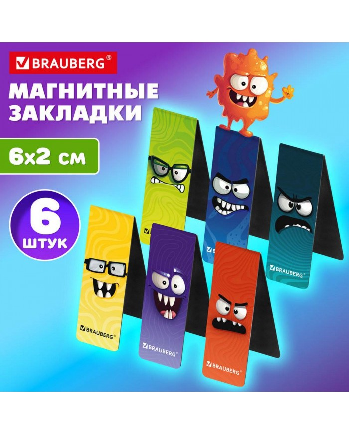 Закладки для книг МАГНИТНЫЕ, "МОНСТРИКИ", набор 6 штук, 60x20 мм, BRAUBERG,