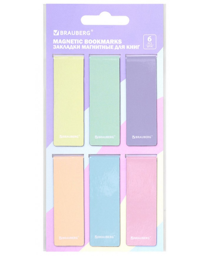Закладки для книг МАГНИТНЫЕ, "PASTEL", набор 6 штук, 60x20 мм, BRAUBERG,