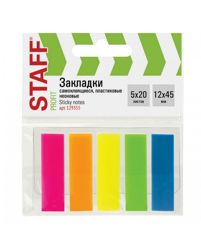 Набор пластиковых закладок 5 неоновых цветов размером 45х12 мм состоит из 100 листов, по 20 закладок каждого цвета. Клейкий слой - 22 Н/м. Легко клеятся к любой поверхности и не оставляют следов. Материал закладок позволяет делать надписи ручкой и карандашом. Уложены на пластиковом основании. Поставляются в полиэтиленовом пакете с европодвесом.