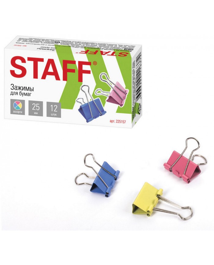 Зажимы для бумаг STAFF "Profit", КОМПЛЕКТ 12 шт., 25 мм, на 100 листов, цветные, картонная коробка